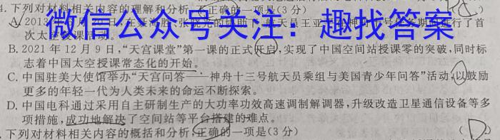 4.下列对材料相关内容的理解和分析,不正确的一项是(3分)(摘编白《揭秘天地通话背后的电科科技》2024月3月24日)年6月20日,在聂海胜、张晓光的协助下,航天员王亚平在神舟十号任务期间进行了首A2013次太空授课活动。B2021年12月9日:“天宫课堂”第一课的正式开启,实现了中国空间站授课零的突破,同时标志着中国太空授课常态化的开始C.中国驻美大使馆举办“天宫问答一·神舟十三号航天员乘组与美国青少年问答”活动;以鼓励更多的年轻一代为人类未来的命运不断探索。D.中国电科通过采用自主研制生产的大功率功效高速调制解调器,升级改造卫星通信设备等多项措施,成功地解决了空间站等平台搭建的难点。D