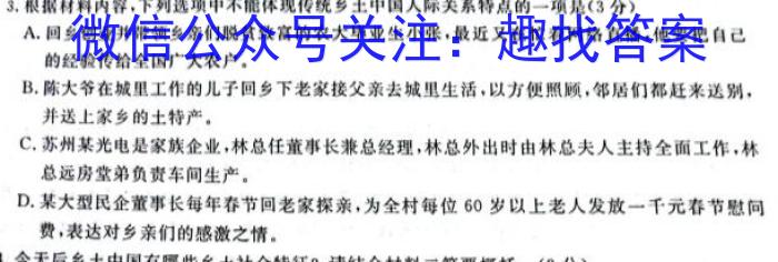 3.根据材料内容,下列选项中不能体现传统乡土中国人际关系特点的一项是(3分)A.回乡创业并带领乡亲们脱贫致富的农大毕业生小张,最近又在忙着网络直插,他要把自己的经验传给全国广大农户,B.陈大爷在城里工作的儿子回乡下老家接父亲去城里生活,以方便照顾,邻居们都赶来送别,并送上家乡的土特产。C.苏州某光电是家族企业,林总任董事长兼总经理,林总外出时由林总夫人主持全面工作,林总远房堂弟负责车间生产。D.某大型民企董事长每年春节回老家探亲,为全村每位60岁以上老人发放一千元春节慰问费,表达对乡亲们的感激之情。