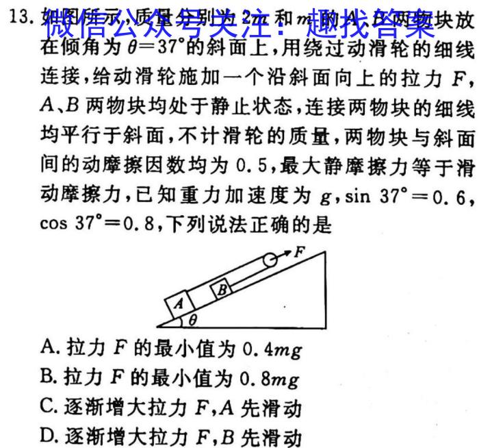 13.如图所示,质量分别为2m和m的A、B两物块放在倾角为=37^的斜面上,用绕过动滑轮的细线连接,给动滑轮施加一个沿斜面向上的拉力F,A、B两物块均处于静止状态,连接两物块的细线均平行于斜面,不计滑轮的质量,两物块与斜面间的动摩擦因数均为0.5,最大静摩擦力等于滑动摩擦力,已知重力加速度为g,37^=0.6,37^=0.8,,下列说法正确的是A.拉力F的最小值为0.4mgB.拉力F的最小值为0.8mgC.逐渐增大拉力F,A先滑动D.逐渐增大拉力F,B先滑动