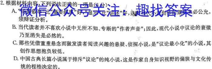 2.根据材料内容,下列说法正确的一项是(3分)A.“场景叙事”比“概要叙事”好,“显示”比“讲述”好,这类当代小说创作的箴规未必公允,须辩证分析。B.当代读者并不喜欢小说中无所不知、专断的“作者声音”;因此,现代小说中议论的衰微乃至消失是必然的。C.那些凭借重重悬念而激发读者阅读兴趣的悬疑、侦探小说,是“议论最小化”的小说,其创作思想抱负较低。D.中国古典长篇小说属于排斥“议论”的纯小说,这是作家自身知识视野的偏狭与文化传统的桎梏决定的。