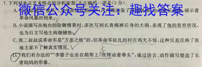 7.下列对本文艺术特点的分析鉴赏,不正确的一项是(3分)A.小说标题为“夜风”,文中多处写到风声,风声既渲染了环境氛围,也有象征意味,暗示着革命风暴的到来。B.小说描写在炮台的防御情景时,多次写到长青棉裤后身的大洞,表现了他的贫穷状况,也为后文写他生病做铺垫C.张二叔叔说革命军是“万恶之极”的,但革命军驻扎的村庄鸡犬不惊,这种反差反映了张地主家不了解真实情况。5D.“我们有办法的”“李婆子也坐在爬犁上,在挥动着拳头”,通过语言、动作描写塑造了长青妈妈的形象。