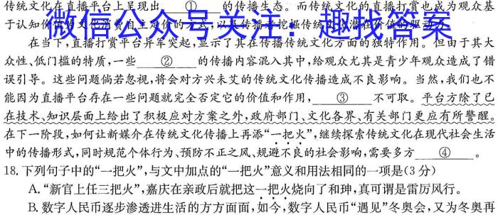 在当下,直播打赏平台异军突起,显示了其在传播传统文化方面的独特作用。但由于其大众性、低门槛的特质,一些②的传播内容混入其中,给观众尤其是青少年观众造成了错误引导。这些问题倘若忽视,将会对方兴未艾的传统文化传播造成不良影响。当然,我们也不能因为直播平台存在一些问题就完全否定它的价值和作用,③不可取。平台方除了已在技术、知识层面上给出了积极应对方案之外,政府部门、文化各界、有关部门更应有所警醒。在下一阶段,如何让新媒介在传统文化传播上再添“一把火”,继续探索传统文化在现代社会生活中的传播形式,同时规范个体行为、预防不正之风、规避不良的社会影响,需要多方④。18.下列句子中的“一把火”,与文中加点的“一把火”意义和用法相同的一项是(3分)