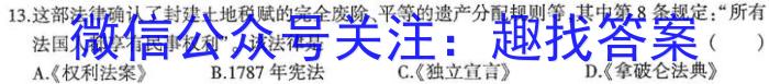 13.这部法律确认了封建土地税赋的完全废除、平等的遗产分配规则等,其中第8条规定:“所有法国人都享有民事权利”。该法律是()A.《权利法案》B.1787年宪法C.《独立宣言》D.《拿破仑法典》