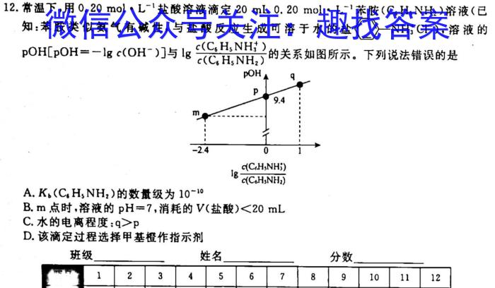 12.常温下,用0.20molL^-1盐酸溶液滴定20mL0.20molL^-1苯胺(C6H5NH2)溶液(已知:苯胺类似氨气有碱性,与盐酸反应生成可溶于水的盐NH3^+Cl^-),溶液的pOH[pOH=-c(OH^-)]与1gc(C6H5NH3^+)c(C6H5NH2)的关系如图所示。下列说法错误的是A.Kb(C6H5NH2)的数量级为10^-10B.m点时,溶液的pH=7,消耗的V(盐酸)pD.该滴定过程选择甲基橙作指示剂班级分数