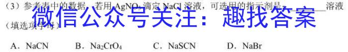 (3)参考表中的数据,若用AgNO3滴定NaC1溶液,可选用的指示剂是:溶液(填选项字母)A.NaCNB.Na2CrO4C.NaSCND.NaBr