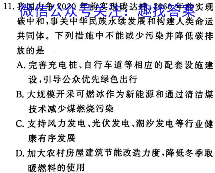 11.我国力争2030年前实现碳达峰,2060年前实现碳中和,事关中华民族永续发展和构建人类命运共同体。下列措施中不能减少污染并降低碳排放的是A.完善充电桩、自行车道等相应的配套设施建设,引导公众优先绿色出行B.大规模开采可燃冰作为新能源和通过清洁煤技术减少煤燃烧污染C.支持风力发电、光伏发电、潮汐发电等行业健康有序发展D.加大农村房屋建筑节能改造力度,降低冬季取暖燃料的使用