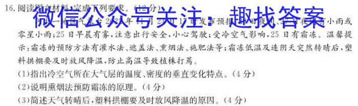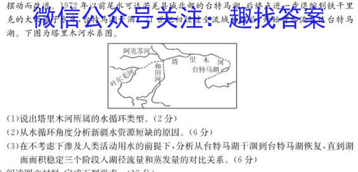 16.阅读图文材料,完成下列要求。(12分)河北一地区气象台2024年11月24日17时发布预报:26日夜间、27日夜间有小雨或零星小雨;25日早晨有雾,注意出行安全,小心驾驶;受冷空气影响,25日有霜冻。温馨提示:霜冻的预防方法有灌水法、遮盖法、熏烟法、施肥法等;霜冻低温及连阴天突然转晴后,塑料拱棚要及时放风降温,防止高温导致植株打蔫。(1)指出冷空气所在大气层的温度、密度的垂直变化特点。(4分)(2)说明熏烟法预防霜冻的原理。(4分)(3)简述天气转晴后,塑料拱棚要及时放风降温的原因。(4分)摆动而改道。1972年以前尾水可达若羌县城北部的台特马湖,后终点进一步退缩到铁干里克的大西海子水库,台特马湖干涸。21世纪初经过全流域治理后,开始有水流复达台特马湖。下图为塔里木河水系图。(1)说出塔里木河所属的水循环类型。(2分)(2)从水循环角度分析新疆水资源短缺的原因。(6分)(3)在不考虑下渗及人类活动用水的前提下,分析从台特马湖干涸到台特马湖恢复,直到湖面面积稳定三个阶段入湖径流量和蒸发量的对比关系。(6分)