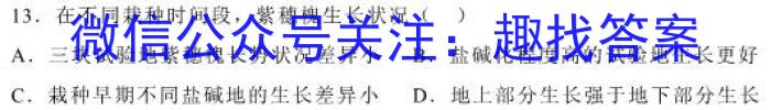 13.在不同栽种时间段,紫穗槐生长状况()A.三块试验地紫穗槐长势状况差异小B.盐碱化程度高的试验地生长更好C.栽种早期不同盐碱地的生长差异小D.地上部分生长强于地下部分生长