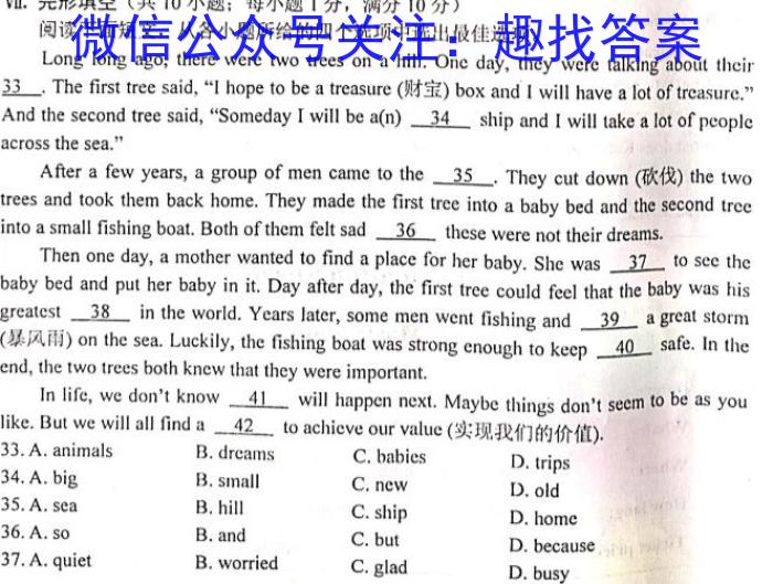 Ⅶ.完形填空(共 10小题;每小题1分,满分10分)阅读下面短文,从各小题所给的四个选项中选出最佳选项。Long long ago, there were two trees on a hill.One day, they were talking about their33 . The first tree said, “I hope to be a treasure (财宝) box and I will have a lot of treasure.”____And the second tree said, “Someday I will be a(n) 34 ship and I will take a lot of peopleacross the se a.”After a few years, a group of men came to the 35.They cut down (砍伐) the twtrees and took them back home. They made the first tree into a baby bed and the second treeinto a small fishing boat. Both of the m felt sad 36 these were not their dreams.The none day, a m other wanted to find a place for her baby. She was 37 to see thebaby bed and put her baby in it. Day after day, the first tree could feel that the baby was hisgreatest 38 in the world. Years later, some men went fishing and 39 a great storm(暴风雨) on the se a. Luckily, the fishing boat was strong cnough to keep 40 safe. In theend, the two trees both knew that they were important.In life, we d on’t know 41 will happen next. Maybe things don’t seem to be as youlike. But we will all find a 42 to achicve our value (实现我们的价值) .33.A.animals B.dreams C.babies D.trips34.A.big B.small C.new D.old35.A.sea B.hill C.ship D.home36.A.so B.and C.but D.because37.A.quiet B.worried C.glad D.busy