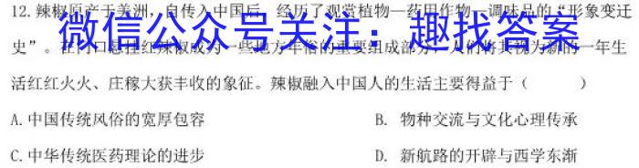 12.辣椒原产于美洲,自传入中国后,经历了观赏植物一药用作物一调味品的“形象变迁史”。在门口悬挂红辣椒成为一些地方年俗的重要组成部分,人们将其视为新的一年生活红红火火、庄稼大获丰收的象征。辣椒融入中国人的生活主要得益于()A.中国传统风俗的宽厚包容B.物种交流与文化心理传承C.中华传统医药理论的进步D.新航路的开辟与西学东渐