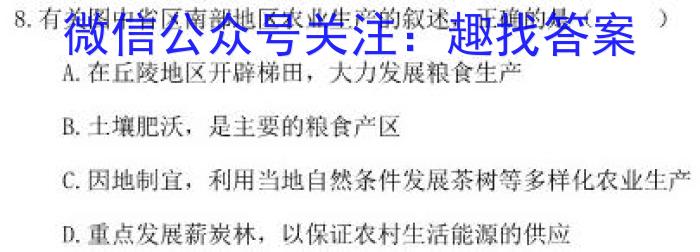 8.有关图中省区南部地区农业生产的叙述,正确的是()A.在丘陵地区开辟梯田,大力发展粮食生产B.土壤肥沃,是主要的粮食产区C.因地制宜,利用当地自然条件发展茶树等多样化农业生产D.重点发展薪炭林,以保证农村生活能源的供应