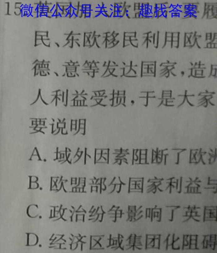 15.英国加入欧盟后,要履民、东欧移民利用欧盟德、意等发达国家,造成人利益受损,于是大家要说明A.域外因素阻断了欧洲B.欧盟部分国家利益与C.政治纷争影响了英国D.经济区域集团化阻碍