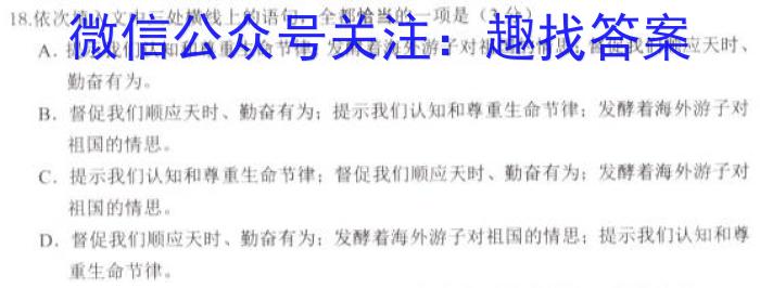 18.依次填入文中三处横线上的语句,全都恰当的一项是(3分)A.提示我们认知和尊重生命节律;发酵着海外游子对祖国的情思;督促我们顺应天时、勤奋有为。B.督促我们顺应天时、勤奋有为;提示我们认知和尊重生命节律;发酵着海外游子对祖国的情思。C.提示我们认知和尊重生命节律;督促我们顺应天时、勤奋有为;发酵着海外游子对祖国的情思。D.督促我们顺应天时、勤奋有为;发酵着海外游子对祖国的情思;提示我们认知和尊重生命节律。