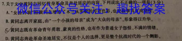 7.关于文中黄同志回忆投身革命及奔赴延安的内容,下列说法不正确的一项是(3分)A.“女扮男装”给黄同志增添了木兰从军般的传奇色彩,也使叙事具有戏剧性。B.黄同志离开家庭,由“一个小孩的母亲”成为“大众的母亲”,形象得以升华。C黄同志既有革命青年勇敢、豪爽的性格,也有作为普通女子怨恨、不满的情绪。D.黄同志奔赴革命圣地延安,不仅是个人的选择,更是整个抗战时代的一个侧影。