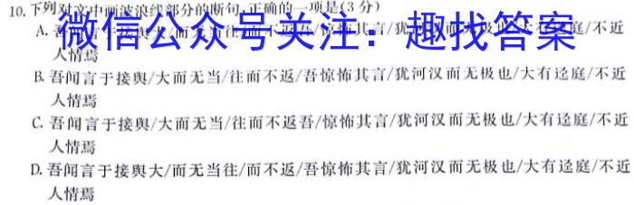10.下列对文中画波浪线部分的断句,正确的一项是(3分)A.吾闻言于接舆大/而无当往/而不返吾/惊怖其言/犹河汉而无极也/大有途庭/不近人情焉B.吾闻言于接舆/大而无当/往而不返/吾惊怖其言/犹河汉而无极也/大有庭/不近人情焉C.吾闻言于接舆/大而无当/往而不返吾/惊怖其言犹河汉而无极也/大有庭/不近人情焉D.吾闻言于接舆大/而无当往/而不返/吾惊怖其言/犹河汉而无极也/大有庭/不近人情焉