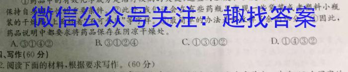 21.下面是文中括号内的四个句子,句子顺序排列正确的一项是(3分A①药品中的有效化学成分是治疗疾病的关键,适宜的温度和湿度则是让这些化学成分保持自身稳定性的重要条件。②此外,我们还会在有些药瓶里发现一些袋装或者塑料小瓶装的干燥剂,上面标着“不可食用”等字样。③最简单的办法是吸收掉多余的水分④因此,药品说明中都要求将药品保存在阴凉干燥处。A.③①④②B.③①②④C.①③④②D.①④③②四、写作(60分)