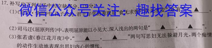 17.补写出下列句子中的空缺部分。(6分)(1)《论语·学而》中,孔子认为,君子好学的表现是“食无求饱”“居无求安”,还有“▲▲”。(2)司马迁《屈原列传》中,表明屈原能以小见大、深入浅出的两句是“(3)张若虚《春江花月夜》中,“▲,”两句写思妇无法躲避月光,两个痴情的动作生动地表现出思妇内心的惆怅。