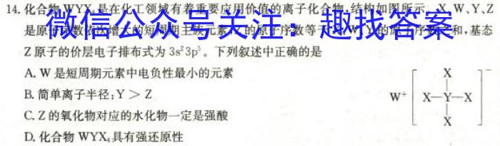 14.化合物WYX4是在化工领域有着重要应用价值的离子化合物,结构如图所示。X、W、Y、Z是原子序数依次增大的短周期主族元素,Z的原子序数等于X、W、Y的原子序数之和,基态Z原子的价层电子排布式为3s^23p^5。下列叙述中正确的是A.W是短周期元素中电负性最小的元素B.简单离子半径:Y>ZC.Z的氧化物对应的水化物一定是强酸D.化合物WYX4具有强还原性