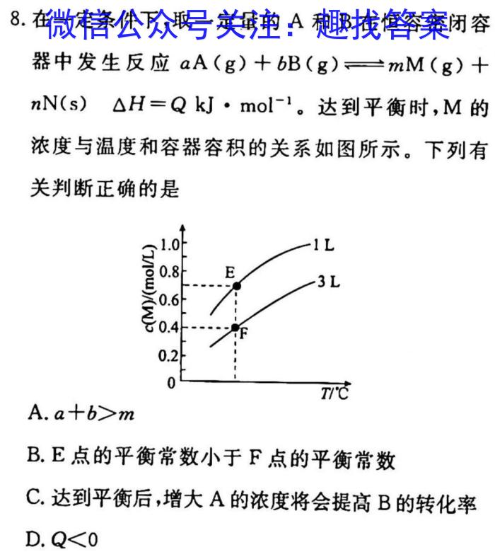 8.在一定条件下,取一定量的A和B在恒容密闭容器中发生反应aA(g)+bB(g)mM(g)+nN(s)H=QkJmol^-1。,达到平衡时,M的浓度与温度和容器容积的关系如图所示。下列有关判断正确的是A.a+b>mB.E点的平衡常数小于F点的平衡常数C.达到平衡后,增大A的浓度将会提高B的转化率D.Q<0