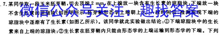 7.某同学取一段玉米胚芽鞘,切去顶端2mm,在上端放一块含有生长素的琼脂块,下端放一块不含生长素的琼脂块(如图甲所示,胚芽鞘形态学上端朝上)。一段时间后,检测发现下端的琼脂块中逐渐有了生长素(如图乙所示)。该同学就此实验做出结论:①下端琼脂块中的生长素来自上端的琼脂块;②生长素在胚芽鞘内只能由形态学的上端运输到形态学的下端。下列