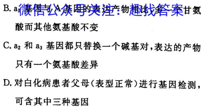 B.a1基因与A基因的表达产物相比,多一个甘氨酸而其他氨基酸不变C.a2和a3基因都只替换一个碱基对,表达的产物只有一个氨基酸差异D.对白化病患者父母(表型正常)进行基因检测,可含其中三种基因