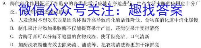 9.酶的催化作用保证了细胞中的各类化学反应能有序地进行,生产生活中酶的应用也十分广泛。下列有关叙述错误的是A.人发烧时不想吃东西是因为体温升高导致消化酶活性降低,食物在消化道中消化缓慢B.制作果汁时添加果胶酶不仅能提高果汁产量,还能使果汁变得清亮C.含酶牙膏可以分解牙缝里的食物残渣,使牙齿亮洁、口气清新D.加酶洗衣粉能有效去除奶渍、油渍等,把衣物清洗得更加干净鲜亮