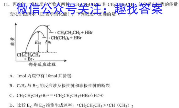 11.丙烷的一溴代反应产物有两种:CH3CH2CH2Br和CH3CHBrCH3,,部分反应过程的能量变化如图所示(Ea表示活化能)。下列叙述不正确的是()A.1mol丙烷中有10mol共价键B.C3H8与Br2的反应涉及极性键和非极性键的断裂C.CH3CH2CH3+Br^+=CH2CH2CH3+HBrH>0D.比较Ea1和Ea2推测生成速率:·CH2CH2CH3>CH(CH3)2