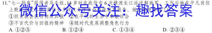 11.“七一勋章”获得者马毛姐,14岁时在战役中6次横渡长江运送解放军。工作后她在平凡岗位上默默为党工作;离休后多次义务作革命传统教育报告。她的事迹体现了()①担贵就会获得物质回报②在平凡的生活中奉献社会③不言代价与回报的精神④随时代发展调整角色行为A.①②③B.①②④C.①③④D.②③④