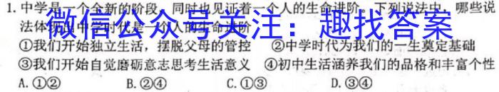 1.中学是一个全新的阶段,同时也见证着一个人的生命进阶。下列说法中,哪些说法体现出中学时代是一个人的生命进阶①我们开始独立生活,摆脱父母的管控②中学时代为我们的一生奠定基础③我们开始自觉磨砺意志思考生活意义④初中生活涵养我们的品格和丰富个性A.①②B.②④C.①③D.③④