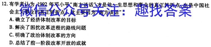 12.有学者认为,1992年“南方谈话”才是他一生思想和事业的真正转折点,也是中国社会主义事业的真正转折点。这主要因为“南方谈话”A.确立了经济体制改革的目标B.解决了困扰改革进程的路线问题C.明确了政治体制改革的方向D.总结了前一阶段改革开放的成就