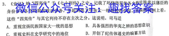 3.《史记》纳“四夷传”于《七十列传》之中,记载了环绕华夏的各少数民族多以藩臣的身份参与各个时期的政治事务,并起到拱卫123大一统政权的作用。从编撰体例上看,这些“四夷传”与其它列传不存在主次之分。这说明,司马迁A.重视宣扬民族国家大一统的思想B.具备强烈的华夷之辨的思想意识C.重视史料在史学研究中的地位D.开创了纪传体通史的编纂方法