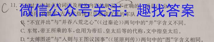 C11.下列对文中加点的词语及相关内容的解说(不正确的一项是(3分)A.禁兵,犹禁军,古代常指保卫京城或宫廷的军队B.“不宜并出”与“并吞八荒之心”(《过秦论》)两句中的“并”字含义不同。C.车驾,帝王所乘的车,也用为帝后、皇太后等的代称,文中指皇太后。D.“太傅图逆”与“入则与王图议国事”(《屈原列传》)两句中的“图”字含义相同。