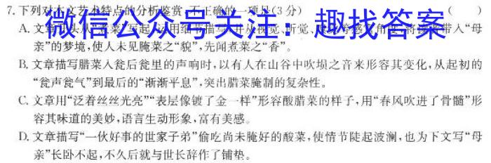 7.下列对本文艺术特点的分析鉴赏,不正确的一项是(3分)()A.文章开头从“煮菜”写起,运用细节描写,并从视觉、听觉,嗅觉等感官角度,将读者带人“母亲”的梦境,使人未见腌菜之“貌”,先闻煮菜之“香”。B.文章描写腊菜入瓮后瓮里的声响时,以有人在山谷中吹埙之音来形容其变化,从起初的“瓮声瓮气”到最后的“渐渐平息”,突出腊菜腌制的复杂性。C.文章用“泛着丝丝光亮”“表层像镀了金一样”形容酸腊菜的样子,用“春风吹进了骨髓”形容其味道的美妙,语言生动形象,富有美感。D.文章描写“一伙好事的世家子弟”偷吃尚未腌好的酸菜,使情节陡起波澜,也为下文写“母亲”长卧不起,不久后就与世长辞作了铺垫。