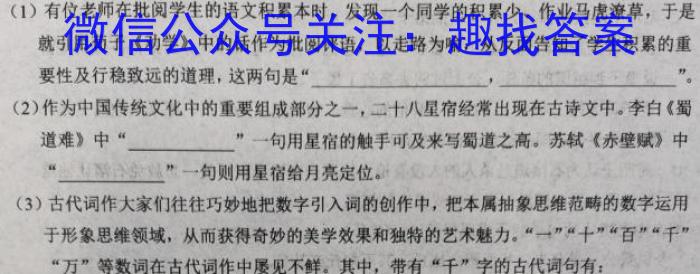 (1)有位老师在批阅学生的语文积累本时,发现一个同学的积累少、作业马虎潦草,于是就引用荀子《劝学》中的话作为批阅评语,以走路为喻,从反面告知了学生积累的重要性及行稳致远的道理,这两句是“,”。(2)作为中国传统文化中的重要组成部分之一,二十八星宿经常出现在古诗文中。李白《蜀道难》中“”一句用星宿的触手可及来写蜀道之高。苏轼《赤壁赋》中“整”一句则用星宿给月亮定位。(3)古代词作大家们往往巧妙地把数字引入词的创作中,把本属抽象思维范畴的数字运用于形象思维领域,从而获得奇妙的美学效果和独特的艺术魅力。“一”“十”“百”“千”“万”等数词在古代词作中屡见不鲜。其中,带有“千”字的古代词句有: