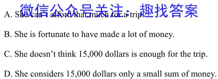 A.She can’t afford that much for a trip.B.She is fortunate to have made a lot of money.C.She doesn’t think 15, 000 dollars is enough for the trip.D.She considers 15, 000 dollars only a small sum of money.