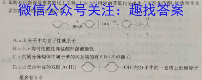 9.苯酚和丙酮都是重要的化工原料,工业上可用异丙苯氧化法来生产苯酚和丙酮,物质转化关系如图,下列说法正确的是OH++abcdA.a、b分子中均含手性碳原子B.a、b、c均可使酸性高锰酸钾溶液褪色C.a的同分异构体中属于苯的同系物的有6种(不包括a)D.c、d反应生成的双酚A(HO.OH)的分子中同一直线上的碳原子最多有5个