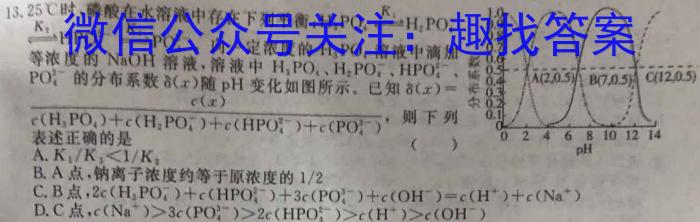 13.13.25^C5℃C时,磷酸在水溶液中存在下列平衡,KH3PO4K2H2PO4^-HPO4^2-PO4^3-。,向一定浓度的H3PO4溶液中滴加等浓度的NaOH溶液,溶液中PO4^3-H3PO4、H2PO4^-、HPO4^2-、的分布系数8(x))随pH变化如图所示。已知8(x)=c(H3PO4)+c(H2)PO4^2+c(HPO4^2-)+c(PO4^3-),则下列表述正确的是()A.K1/K33c(30^-)+3c(PO4^3-)+c(H^+)+c(Na^+)(Na2^-)+C(Nc(Na^+)>3c(PO4^3-)>2c(HPO4^2-)>c(H^+)>c(OH^-)