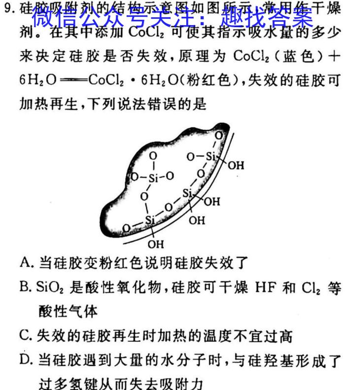 9.硅胶吸附剂的结构示意图如图所示,常用作干燥剂。在其中添加CoCl2可使其指示吸水量的多少来决定硅胶是否失效,原理为CoCl2(蓝色)+6H2OCoCl26H2O(粉红色),失效的硅胶可加热再生,下列说法错误的是A.当硅胶变粉红色说明硅胶失效了B.SiO2是酸性氧化物,硅胶可干燥HF和Cl2等酸性气体C.失效的硅胶再生时加热的温度不宜过高D.当硅胶遇到大量的水分子时,与硅羟基形成了过多氢键从而失去吸附力
