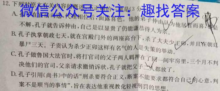 12.下列对原文有关内容的概述,不正确的一项是(3分)A.孔子在官居司寇,代理相位后,面露喜色,他的弟子仲由认为D不解,孔子就告诉仲由,自己是以显贵了仍能谦恭待人为为他居省而而喜,B.孔子执掌朝政七天,就在宫殿门外的两座高台下,杀了大夫少少暴尸三天。子贡认为杀少正卵这样有名气的人是失策的举动。并且在朝C.孔子做鲁国大法官时,将打官司的父子两人羁押在了同一间牢房里,三个月不判都放了。D.孔子引用《尚书》中的话“刑杀要符合正义,断案不能要求都符合自己的心意,判案不是顺当的事情”,旨在表达他重视教化轻视刑罚的思想。决他们的官司,父亲请求撤销诉状孔子就把父子