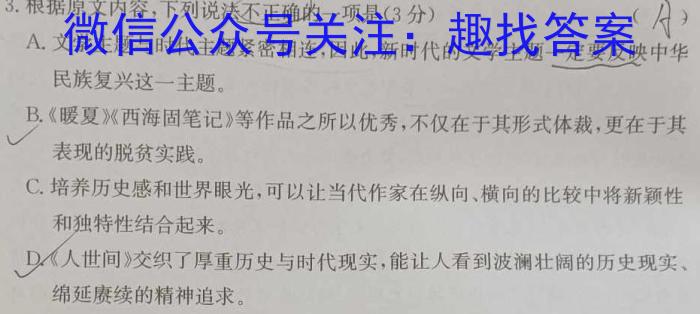 3.根据原文内容,下列说法不正确的一项是(3分)AA.文学主题与时代主题紧密相连,因此,的文学主题一定要反映中华民族复兴这一主题。B.《暖夏》西海固笔记》等作品之所以优秀,不仅在于其形式体裁,更在于其表现的脱贫实践。C.培养历史感和世界眼光,可以让当代作家在纵向、横向的比较中将新颖性和独特性结合起来。D.《人世间》交织了厚重历史与时代现实,能让人看到波澜壮阔的历史现实、绵延赓续的精神追求。