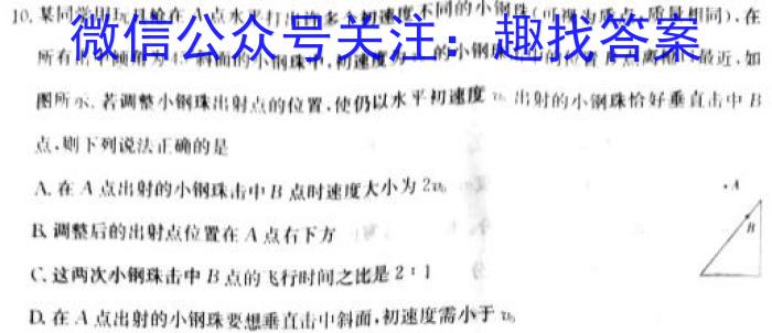 bn10.某同学用玩具123在A点水平打出许多个初速度不同的小钢珠(可视为质点,质量相同),在45^所有击中倾角为45斜面的小钢珠中,初速度为m.的小钢珠击中的位置B点离123口最近,如l111图所示.若调整小钢珠出射点的位置,使仍以水平初速度m出射的小钢珠恰好垂直击中B点,则下列说法正确的是2x0A.在A点出射的小钢珠击中B点时速度大小为2uB.调整后的出射点位置在A点右下方C.这两次小钢珠击中B点的飞行时间之比是21D.在A点出射的小锅珠要想垂直击中斜面,初速度需小于m