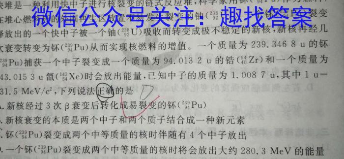 1.快堆是一种利用快中子进行核裂变的链式反应堆,科学家用钚(94^239Pu)作为燃料,在堆心燃料环的外围再生区放置不易发生裂变的铀(92^238U)。一个钚(94^239Pu)裂变释放出的一个快中子被一个铀(92^238U)吸收而转变成极不稳定的新核,新核再经几次衰变转变为钚(94^239Pu)从而实现核燃料的增值。一个质量为239.3468u的钚(94^239Pu)捕获一个中子裂变成一个质量为94.0132u的锆(40^94Zr))和一个量为143.0153氙(54^143Xe)时会放出能量,已知中子的质量为1.0087u,其中1u=931.5MeV/c^2,下列说法正确的是DA.新核经过3次β衰变后转化成易裂变的钚(94^239Pu)B.新核衰变的本质是两个中子和两个质子结合成一种新元素C.钚(94^239Pu)裂变成两个中等质量的核时伴随有4个中子放出一个钚(94^239Pu)