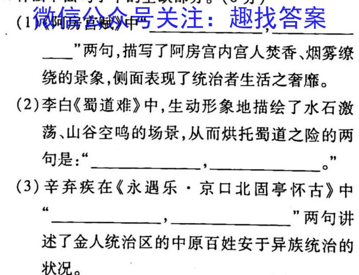 (1)《阿房宫赋》中“,”两句,描写了阿房宫内宫人焚香、烟雾缭绕的景象,侧面表现了统治者生活之奢靡。(2)李白《蜀道难》中,生动形象地描绘了水石激荡、山谷空鸣的场景,从而烘托蜀道之险的两句是:“,。”(3)辛弃疾在《永遇乐·京口北固亭怀古》中“,”两句讲述了金人统治区的中原百姓安于异族统治的状况。