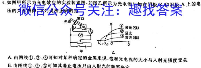 4.如图甲所示为光电效应的实验装置图,如图乙所示为光电流与加在阻极K和阳极A.上的电压的关系图像,下列说法正确的是A.由图线①、②、③可知对某种确定的金属来说,饱和光电流的大小与入射光强度无关B.由图线①、②、③可知其遏止电压只由入射光的频率决定C.只要增大电压,光电流就会一直增大D.不论哪种颜色的入射光,只要光足够强,就能发生光电效应