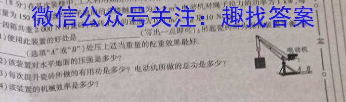 的2.(8分)在某次装修中,工人利用如图所示的装置将一批凳砖运到10m高的楼上若装置10m的总质量为150kg,底盘与水平地面的总接触面积为0.5m,电动机对绳子拉力的功率为1kw,每次150kg,0.5m^2,次提升四箱共重2000N的瓷砖,瓷砖上升的速度为0.4m/s.(g取10N/kg)2000N0.4m/s.(g10N/kg)(1)使用此装置的好处是(写出一点即可):吊起瓷砖时为保持装置平衡,在(选填A”或B”)处压上适当重量的配重效果最好.A”(2)该装置对水平地面的压强是多少?(3)每次提升瓷砖所做的有用功是多少?电动机所做的总功是多少?(4)该装置的机械效率是多少?