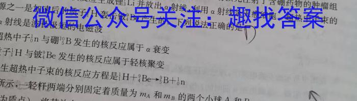 1.一种生物靶向放射治疗模式,其原理是利用超热中子n束照射预先注射了含硼药物的肿瘤组织部位,与硼5^10B发生核反应生成锂Li并放出α射线,利用α射线杀灭癌细胞。超热中子束的来源之一是加速后的质子轰击铍Be产生的。下列说法正确的是DA.α射线是波长极短的电磁波B.超热中子n与硼5^10B发生的核反应属于α衰变C.质子1^1H[与铍Be发生的核反应属于轻核聚变D.产生超热中子束的核反应方程是1^1H+4^9Be5^9B+0^1n
