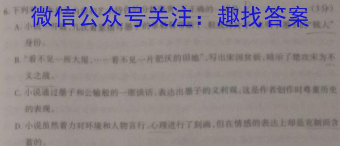 6.下列对文本相关内容和艺术特色的分析鉴赏,不正确的一项是B(3分)A.小说一开篇,几次着重写墨子的草鞋鞋带断了硅成碎片了,点明了墨子的”身份。B.”看不见一所大屋,.看不见一片肥沃的田地,写出宋国贫弱,暗示了绝攻宋为不义之战C.小说通过墨子和公输般的一席谈话,表达出墨子的义利观,这是作者创作时尊重历史的表现D.小说虽然着力对环境和人物言行,心理进行了刻画,但在情感的表达上却是克制面含
