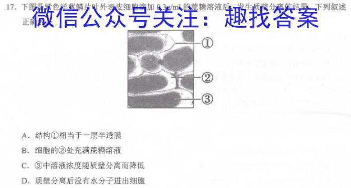 17.下图是紫色洋葱鳞片叶外表皮细胞滴加0.3g/ml1的蔗糖溶液后,发生质壁分离的结果。下列叙述正确的是A.结构①相当于一层半透膜B.细胞的②处充满蔗糖溶液C.③中溶液浓度随质壁分离而降低D.质壁分离后没有水分子进出细胞