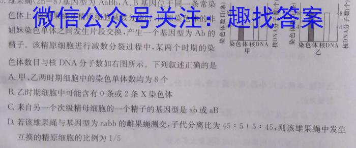 5.雄果蝇(2n=8)基因型为AaBb,A、B基因位于同一条常染色体上,该雄果蝇某精原细胞减数分裂时,同源染色体的非姐妹染色单体之间发生片段交换,产生一个基因型为Ab的精子。该精原细胞进行减数分裂过程中,某两个时期的染色体数目与核DNA分子数如右图所示。下列叙述正确的是A.甲、乙两时期细胞中的染色单体数均为8个B.乙时期细胞中可能含有0条或2条X染色体C.来自另一个次级精母细胞的一个精子的基因型是ab或aBD.若该雄果蝇与基因型为aabb的雌果蝇测交,子代分离比为45:5:5:45,则该雄果蝇中发生互换的精原细胞的比例为1/5