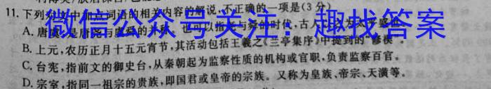 11.下列对文中加点词语的相关内容的解说,不正确的一项是(3分)A.唐虞,是唐尧与虞舜的并称,也可以指尧与舜的时代,古人以之为太平盛世世.B.上元,农历正月十五元宵节,其活动包括王羲之《兰亭集序》中提到的“修禊”。C.台宪,指前文的御史台,从秦朝起为监察性质的机构或官职,负责监察百官,C.D.宗室,指同一祖宗的贵族,即国君或皇帝的宗族。又称为皇族、帝宗、天潢等。)